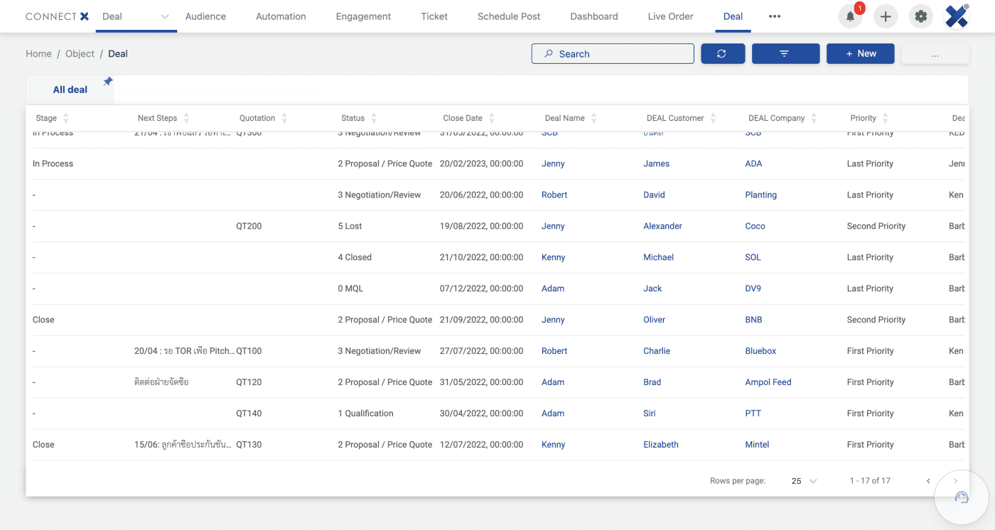 นั่นเป็นวิธีที่คุณปิดการขายบันทึกผลลัพธ์ของผู้ติดต่อ ชื่อผู้ติดต่อ ชื่อบริษัท รายละเอียดการประเมินมูลค่าข้อตกลง และเปอร์เซ็นต์ความน่าจะเป็นที่จะชนะ ด้วย Deals management ของ Connect X ทุกรายละเอียดเล็กๆ น้อยๆ จะทำให้คุณนำหน้าคู่แข่ง