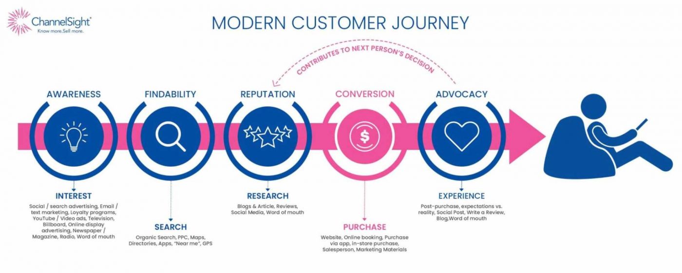 การเดินทางของลูกค้า (Customers Journey) คือแผนที่เส้นทางที่ลูกค้าใช้ตั้งแต่การเข้ามาเลือกซื้อจนกระทั่งปิดการขาย เส้นทางของลูกค้า(Customer Journey) สามารถคดเคี้ยวและวนเวียนไม่เหมือนกับช่องทางการตลาดแบบเดิมในอดีตที่ยังไม่มีการขายแบบออนไลน์ ยิ่งลูกค้าเลือกซื้อขายของนานเท่าไหร่ เส้นทางของลูกค้า โดยเฉลี่ยก็จะยิ่งยาวขึ้นและซับซ้อนมากยิ่งขึ้นแต่นั้นก็เป็นข้อดีทำให้เรามีข้อมูลที่สามารถเก็บเพิ่มและนำไปวิเคราะห์ได้เพิ่มมากยิ่งขึ้น